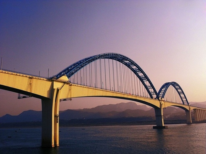 宜萬鐵路宜昌長江大橋位于宜昌港煙收壩水域,全長2527米,橋面設計為雙軌道,主梁連續剛構跨徑達275米,在同類型鐵路橋中位居全國第一。拱肋計算跨度264米,為目前國內鐵路最大跨度的鋼管混凝土拱。